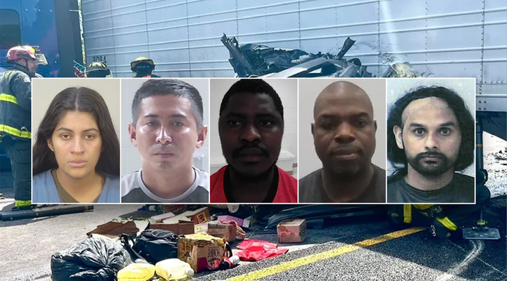 Five mugshots of alleged illegal immigrants accused of deadly car crashes from around the U.S. From left, Noelia Sarah Martinez-Avila, Juan Alfredo Chavarria-Lezama, Lionel Francisco, Mukendi Mbiya and Harjinder Singh, inset over a photo showing the scene of a deadly accident in which Singh has been charged. (ICE, Dane County Sheriff’s Office, Livingston Parish Sheriff’s Office, St. Lucie County Sheriff’s Office)