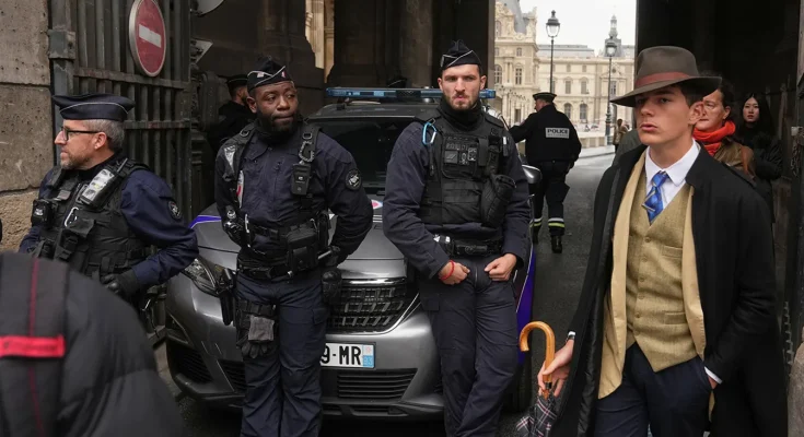 Police officers block access to the Louvre after a robbery Oct. 19 in Paris. (AP Photo/Thibault Camus)